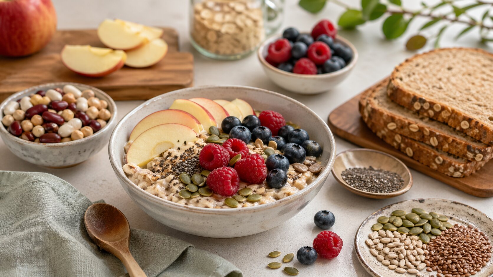 Дружелюбный гид по клетчатке: что это такое, почему она важна и как просто есть больше клетчатки естественным образом — с овсом, фасолью, овощами, фруктами, семенами и цельными злаками.