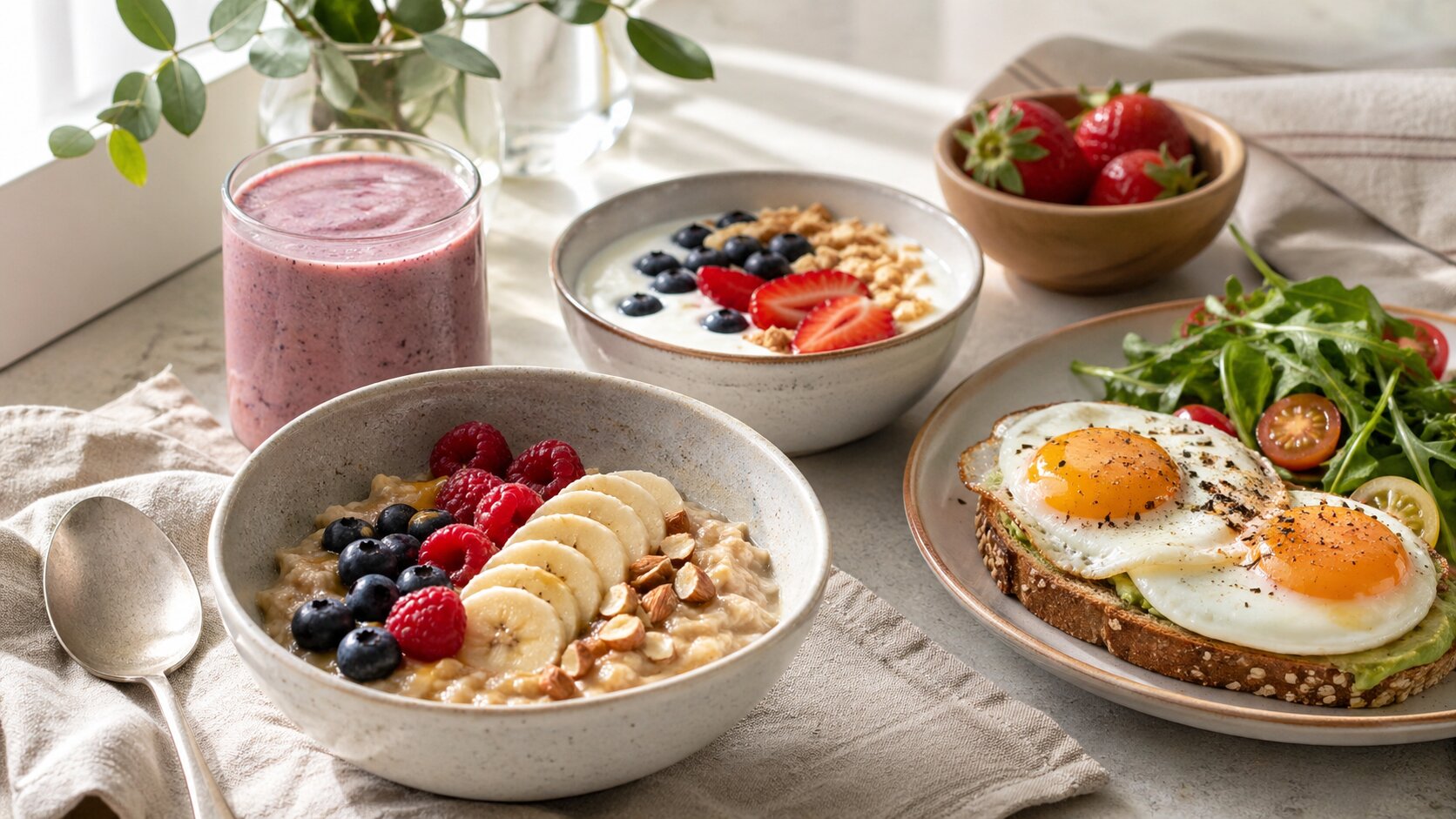 Простые и сбалансированные идеи завтраков с овсянкой, яйцами, йогуртом, фруктами, тостами и смузи, чтобы утро было легким, сытным и приятным.